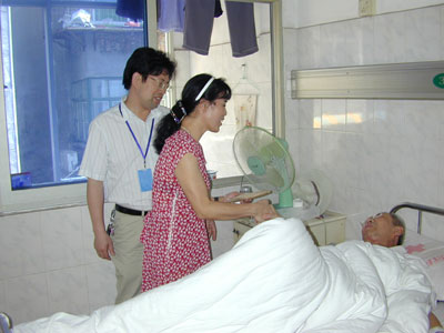 愛心捐款 發(fā)布時間:2008年6月6日 預覽:4005次 我院原質控科退休職工姚安絡身患肺癌和鼻喉癌,家境困難,院黨委十分關心和愛護,在周會上進行了動員,先后有職工313人捐款9495元。圖為副院長黃志堅、工會主席蔡春香代表院黨委、全院職工帶著愛心善款到耳鼻喉科看望了正在住院治療的姚安絡。 圖/文:張永明 周文娟