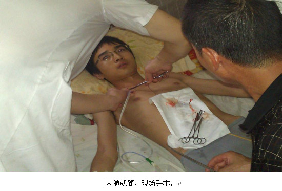 在沒有理想環(huán)境和嚴(yán)格消毒條件的情況下,只能因陋就簡!經(jīng)過迅速的術(shù)前準(zhǔn)備,黃醫(yī)生主刀、勘探組醫(yī)生當(dāng)助手,對病人進(jìn)行了胸部局麻、切口、插管、排氣手術(shù)。在危急的氣氛中、酷熱的空氣里,黃醫(yī)生頭上流下的汗水把眼鏡鏡片都浸花了,助手給他擦了一遍又一遍。不到一個(gè)小時(shí),手術(shù)取得了成功!